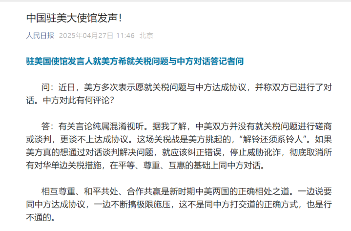 | 驻美国使馆发言人就美方希就关税问题与中方对话答记者问。 问:近日,美方多次表示愿就关税问题与中方达成协议,并称双方已进行了对话。中方对此有何评论? 答:有关言论纯属混淆视听。据我了解,中美双方并没有就关税问题进行磋商或谈判,更谈不上达成协议。这场关税战是美方挑起的,“解铃还须系铃人”。如果美方真的想通过对话谈判解决问题,就应该纠正错误,停止威胁讹诈,彻底取消所有对华单边关税措施,在平等、尊重、互惠的基础上同中方对话。 相互尊重、和平共处、合作共赢是新时期中美两国的正确相处之道。一边说要同中方达成协议,一边不断搞极限施压,这不是同中方打交道的正确方式,也是行不通的。